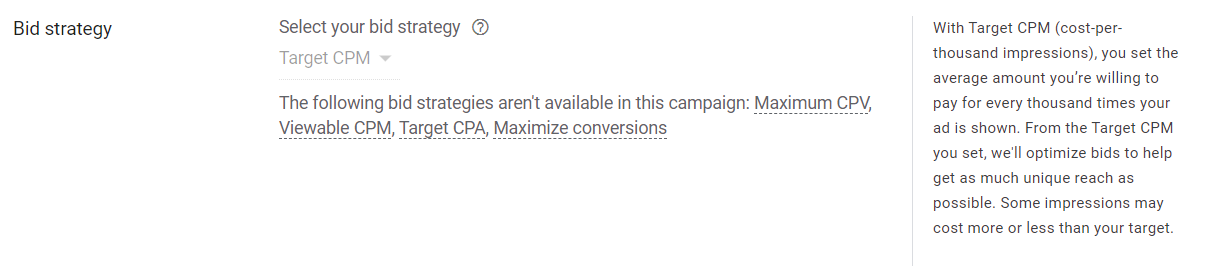 With Manual cost-per-view bidding, you’ll pay based on the number of impressions, that is times your ads are shown. Google only offers manual CPM bidding for video advertising campaigns on the Google display network. Instead of paying for video ad placements on a cost-per-view basis, advertisers can choose to bid for video impressions directly using the manual CPM bidding strategy. It is a bidding strategy where the average amount is set manually for every thousand impressions made and hence it helps to reach the eyes of maximum people.