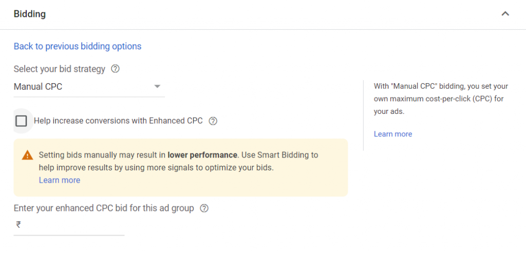 To use this strategy in Search Ads, one must select “Manual CPC” under non-recommended bidding options and click on “Help increase conversions with Enhanced CPC”, as depicted in the image below;