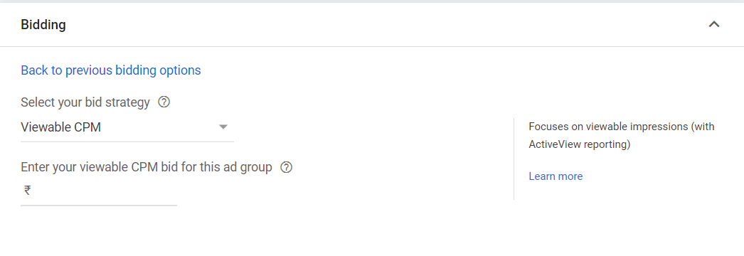 The same applies to Display Ads as well, in addition to entering the specific amount of bid, as depicted in the image below;
