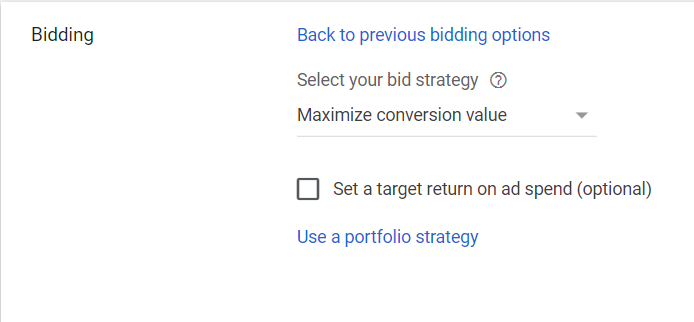 To use this strategy in Search Ads, one must select “Maximize Conversion Value” under non-recommended bidding options, as depicted in the image below;