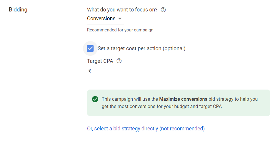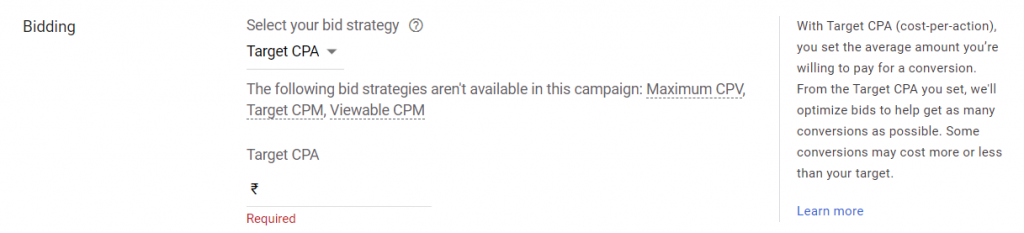 In the case of Display Ads, one can choose bidding options as “conversions” in the recommended options or select “Target CPA” from the non-recommended bidding options, as depicted in the image below