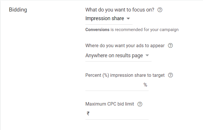 To use this strategy in Search Ads, one must select the option “Impression Share” directly from bidding options as depicted in the image below;