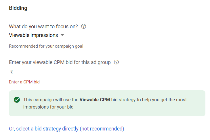 To use this strategy in Display Ads, one can directly select “viewable impressions” from the options; the same is depicted in the image below;